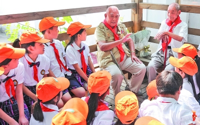 抗战老兵张翻身(左四)和周传木给孩子们讲述自己的战斗故事。9月7日,全国各地中小学开学,新学期伊始适逢中国人民抗日战争暨世界反法西斯战争胜利70周年纪念日,一些地方通过多样的主题活动把新学期教育和历史爱国教育结合起来。