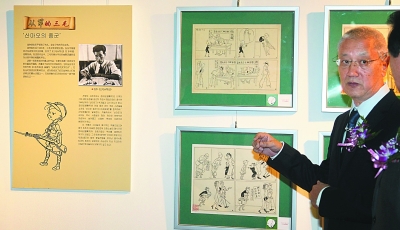 9月7日,在韩国首尔弘益大学现代美术馆,张乐平之子张慰军向嘉宾介绍漫画作品。当日,“纪念中国人民抗日战争暨反法西斯战争胜利70周年及张乐平‘三毛’形象80周年回顾展”的首场海外展览在韩国首尔举行开幕式。