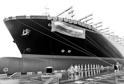 9月12日,即将命名交付的“郑和号”集装箱船靠泊在上海外高桥造船有限公司码头。当日,以航海家郑和名字命名的18000标准箱超大型集装箱船在上海完工并交付给承租运营方——法国达飞海运集团公司。其命名交付,标志着中国造船跨入了世界超大型集装箱船开发、设计和建造的第一方阵。 新华社记者 陈飞摄