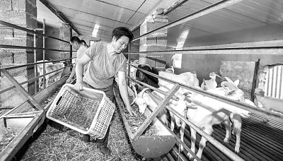 为加强对村级党组织管理,吉林省集安市自2009年以来对126个行政村党组织书记实行“三级联评”考核制度:市委组织部专门成立基层干部科,对村党组织书记实行党员和村民代表测评、乡镇党委评价、市委联合考核组考评的“三级联评”。其中,促进村级集体经济发展成为重要考评指标。“三级联评”实行6年来,不仅改善了各村党组织书记的工作状态和落实效率,也有效带动了村民集体致富。图为集安市麻线乡红星村党支部书记王金福(前)在养殖场喂羊。2014年,他带头创办养殖场,填补了集体经济的项目空白。