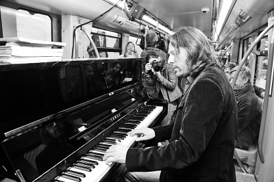 9月12日,法国钢琴家弗兰克·布拉雷在布鲁塞尔地铁一号线“音乐专列”举办了一场别开生面的“地铁流动音乐会”。列车的中间部位成了钢琴的“舞台”,乘客可以通过扩音器身临其境地欣赏布拉雷演奏的巴赫、莫扎特、贝多芬、肖邦等作曲家的作品。图为拉布雷在“地铁流动音乐会”上演奏。