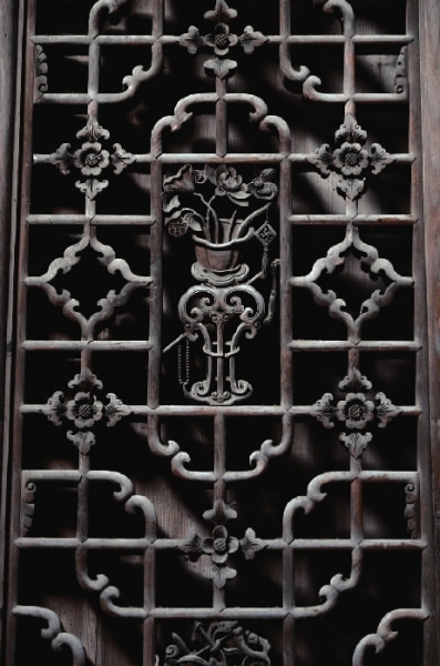 在婺源先人构建的荣耀里,黛瓦粉墙,青砖门头,砖雕门面,石刻漏窗,斗拱雕梁,厅堂天井,集结生成了家园往事的基调,追求与传递的是传统文化中自然人文的“天人合一”。木雕在婺源古民居雕刻装饰中,几乎涵盖了所有的木质构件:梁架、立柱、栏板、门窗、隔扇、雀替等等,或浮雕,或透雕,玲珑、剔透、生动,花卉、山水、人物,一幅幅都是吉祥图案的精美雕刻;砖雕则采用质地坚细的水磨青砖,经过平雕、浮雕、缕雕,门楼、门楣之上便有了典雅、庄重的雕饰图案;而用于廊柱、门墙、牌坊等处的石雕呢,或浮雕,或圆雕,刀法精致、古朴,动植物形象栩栩如生……推开虚掩的大门,拂去岁月的风尘,不知有多少后人在凝望,又有多少后人在怀想?!在幽长的深巷与挺阔的商字门楼中,依然透出一种和谐与安宁,像唐诗宋词一样古老而深远,像一年又一年绵绵的春雨一样滋润而经久。仿佛千年、百年遵循着诗词的韵律,走入五言七绝的某个意境中,不曾回来。