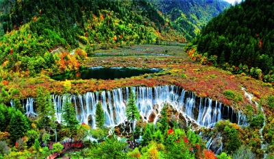从高角度拍摄四川省九寨沟诺日朗瀑布,使这里的秋季植物和峡谷地貌一览无遗。 李贵云摄