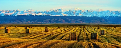 照片拍自昭苏马场,它位于新疆维吾尔自治区伊犁哈萨克自治州昭苏县,画面远处是天山,巍峨矗立在天际。在秋季,天山雪水灌溉下的良田迎来大丰收。当地牧民喜欢将收割剩下的秸秆打成大大的草捆,一来可以出售,二来可以作为冬季牲畜的粮草。 赵 磊摄