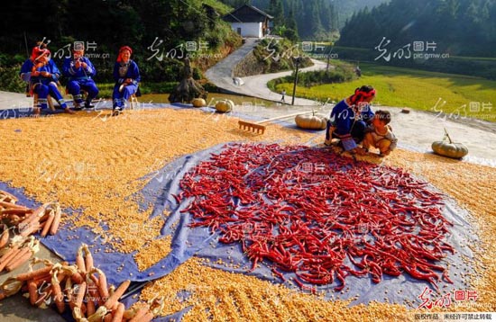 图为9月18日,天柱县高酿镇邦寨村,家家户户抢晒玉米、辣椒。 龙胜洲摄/光明图片