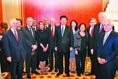 习近平指出,国会在美国政治生活中发挥着独特作用,对美国外交政策包括对华政策具有重要影响。建交36年来,中美关系取得了历史性进展,这是中国历代领导集体和美国民主、共和两党历届政府共同努力的结果,也离不开两国立法机构支持。2013年,我同奥巴马总统在安纳伯格庄园会晤以来,中美在双边、地区、全球层面各领域的协调与合作都上了一个新台阶。这次访问期间,我同奥巴马总统举行了坦诚深入会谈,同美国社会各界广泛接触。双方同意继续深化两国战略沟通,增进战略互信,加强经贸、两军、人文、气候变化、发展等领域以及重大国际地区问题上的合作。