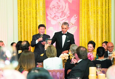 宴会开始后,奥巴马和习近平分别致祝酒辞。奥巴马在致辞中再次对习近平来访表示热烈欢迎。奥巴马表示,习近平主席和我在此次会谈中就继续加强两国各领域合作达成共识。美中不仅需要合作,也能保持合作,因为两国人民的长久友谊使我们充满信心。二战中中国村民营救美国飞行员,两国人民那时起就结下了兄弟般情谊。近年来双方民间旅游、留学越来越多,交往日益频繁。近期两国共同帮助非洲抗击埃博拉疫情,谱写了美中携手应对全球性挑战的佳话。两国民间友好持续发展,成为美中关系的一个重要支柱。我们要以海纳百川的精神,通过继续扩大合作,使美中两国更加强大。