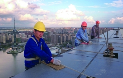 | 在百米高楼上,他们不畏艰辛美化城市。在蓝天白云的映衬中,城市就在他们的脚下。 顾正山摄 |