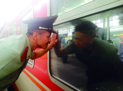 | 铁打的营盘流水的兵,又到了一年一度的退伍季。窗内窗外的约定,手心贴手心的承诺,这就是战友情。 陆振鑫摄 |