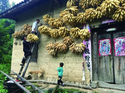 | 金秋时节,陕西南部大巴山深处的平利县,农户正在挂晾丰收的玉米。向晓东摄 |