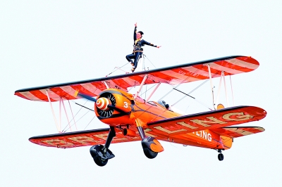 九月二十六日,在二〇一五郑州航展上,百年灵空中漫步飞行队驾驶二十世纪四十年代的活塞式敞篷双翼飞机,和在机翼上的进行特技表演的女郎一起进行了精彩绝伦的“云中漫步”。新华社记者 李博摄
