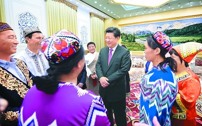 下午5时许,人民大会堂新疆厅内气氛热烈。看到习近平已经等候在这里,13名代表兴奋地围拢到总书记身旁,纷纷介绍家乡变化和自己的生活、工作情况。习近平同代表们一一握手、亲切交谈。习近平表示,见到大家感到十分高兴。前不久,我收到了维吾尔族艾尼瓦尔姐妹的来信和“同心共筑中国梦”十字绣匾。你们两姐妹的绣品花了不少心思和功夫;来信情真意切,反映了新疆农村的显著变化,反映了广大维吾尔族同胞对祖国、对民族团结的热爱。最近,我们国家大事喜事很多。这些天,我们都在节日中,刚刚过了中秋节,又迎来了国庆节。前不久,我们庆祝了西藏自治区成立50周年。这几天,中央代表团正同新疆各族人民一道,庆祝新疆维吾尔自治区成立60周年。我特意把你们请过来,来京参加国庆活动,共同庆祝我们伟大祖国的生日。
