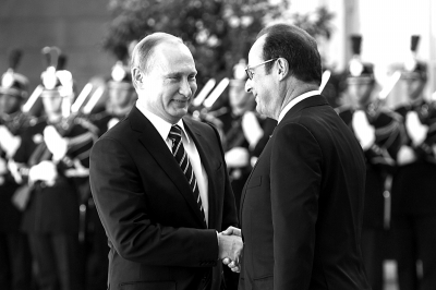 10月2日,法国总统奥朗德(右)在巴黎爱丽舍宫欢迎到访的俄罗斯总统普京。法国总统奥朗德、德国总理默克尔、俄罗斯总统普京和乌克兰总统波罗申科于2日在位于巴黎的法国总统府爱丽舍宫举行一系列双边和多边会谈,讨论乌克兰东部局势以及今年2月签署的新明斯克协议的实施情况。鉴于俄罗斯空袭叙利亚境内目标引起高度关注,叙利亚问题也将成为重要磋商议题。