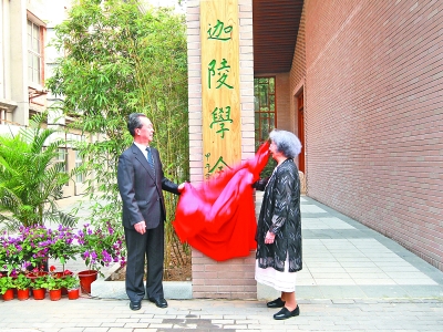 南开大学党委书记薛进文(左)与叶嘉莹先生共同为“迦陵学舍”揭牌。聂际慈摄