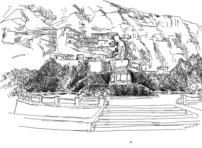当我们走进大门时就看到高僧鸠摩罗什若有所思的雕像端坐在山前的圆坛上,而数百座石窟就分布在不远处的明屋达格山崖上,并以此划分为谷西、谷东、谷内和后山四大窟区。其中谷西区石窟最多,梯道相连,鳞次栉比。拾阶而上,面对风景如画的明屋达格山,举目四望,克孜尔千佛洞的雄姿尽收眼底;宽阔的悬崖之上,石窟层层相叠,宛如蜂巢。石窟间,悬崖下,山光、水色、红柳、绿树、石窟,交相辉映,绮丽多姿,构成了一幅美丽的画卷。