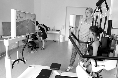 此外,为了使治疗更加有效,“新温泉”今年春天还从瑞士进口了世界最先进的“行走机器人”,这是捷克目前唯一的一台,也是记者此行的最大看点。行走机器人给予不能独立行走的脑瘫或脑、脊髓神经相关问题患者以完全的支撑,帮助他们在电子行走机上按照屏幕的提示做出走、跳、转身等各种平时根本无法完成的动作。针对儿童,屏幕上还呈现出卡通游戏的进程提示他们做出相应的动作。机器人将其行走时的肌肉力量、关节活动度、速度等数据加以计算并储存,形成对患儿最有利的运动功能模式。由于儿童大脑神经的可塑性强,如果辅以有效合理的骨骼肌肉训练,可以大大加快治疗进程,行走机器人的引进对康复的推动力显而易见。最关键的是,这种理疗方式不但充满了乐趣,还帮助孩子们完成了做梦才能进行的动作,每一个机器人上的孩子都开心地合不拢嘴。
