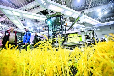 11月10日,在德国汉诺威,与会者在中联重机展区参观收割机。2015年德国国际农业机械博览会11月8日至14日在汉诺威举办,100家中国农机企业在展会首日登台亮相。 新华社记者 张帆摄