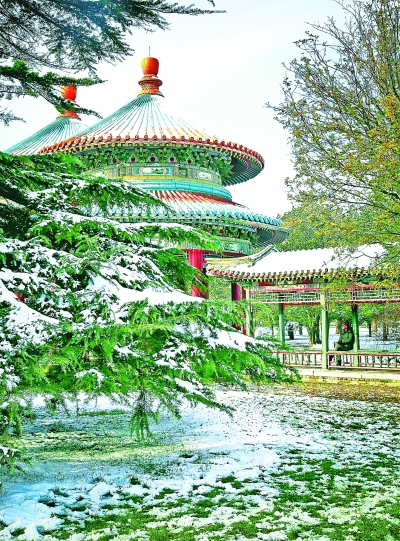 11月24日,北京再迎瑞雪,天坛公园内的双环亭青松映雪,美不胜收。
