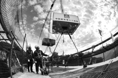 12月3日,随着最后一片重达41吨加劲梁的精准吊装,湖南张家界大峡谷玻璃桥钢箱梁成功合龙。据悉,张家界大峡谷玻璃桥总长430米、宽6米,桥面距离谷底相对高度约300米。桥面全部采用透明玻璃铺设,最大游客容量为800人。目前,大桥建设进入施工尾期,预计2016年“五一”节前对外开放。图为张家界大峡谷玻璃桥合龙施工现场。