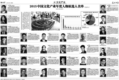 经过专家评委、地方文化产业主管部门、本报各地记者站和网络自荐等渠道的推举,以及初审阶段专家评委的投票评议,“2015中国文化产业年度人物”100名候选人的名单已于先期产生并向社会公布。近日,经过微信投票与50位专家评委评议,从100位候选人中确定了“2015中国文化产业年度人物”30位候选人名单。他们是(按姓氏笔画排序):于冬、王潮歌、吉西平、朱明跃、任仲伦、刘勇利、江志强、苏志刚、苏忠、李勇、吴国平、邱伟、张晨、陈建国、茅院生、赵小强、柯利明、钟伟鹏、贾跃亭、徐俊、徐滔、高素梅、黄进清、龚次敏、程武、童之磊、童健、曾凤飞、蔡剑峰、黎瑞刚。