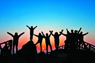 ①:1月1日,人们在北京西山顶上伸出双手拥抱新年第一缕曙光。