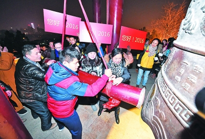 ②:2015年12月31日夜晚,市民在南京玄奘寺撞钟,迎接新年。