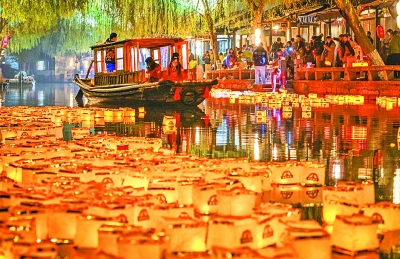 ③:2015年12月31日夜晚,200多名游客聚集在水乡周庄镇,施放河灯,迎接2016年的到来。