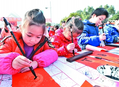 日前,浙江绍兴永和少儿书画馆在城市广场举行迎新写送春联活动,120余名少儿书法爱好者将书写的2000余幅春联现场送给市民和社区居民。图为孩子们在书写春联。新华社发