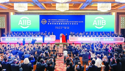亚投行57个创始成员国代表团团长共同按下标志亚投行正式启动的启动键后,习近平为亚投行标志物“点石成金”揭幕。标志物象征成员国期待亚投行不断创造点石成金的奇迹,推动亚洲乃至世界经济可持续发展。