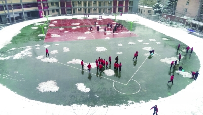 | 一场小雪覆盖了整个校园。午饭过后,塑胶操场在各负责班级的努力下迅速被清理出来,从四楼望去趣味盎然。赵敏占摄 |