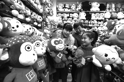 日前,市民在北京一家市场选购“金猴”绒饰品。随着猴年春节的临近,北京市场上具有浓郁民俗文化特点的猴年玩具、摆件、挂件及生肖饰品开始热销。本报记者 郭俊锋摄