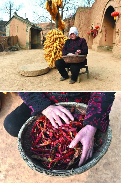 上图:现年70岁的山西平陆县杜马乡东坪头村村民楼梅梅在挑选干辣椒;下图:楼梅梅给孩子准备的自家种的辣椒。楼梅梅的两儿两女都在外工作。老人说,孩子们爱吃辣的,她还准备了红薯粉条、海带、豆腐,就等着孩子们回来过年。