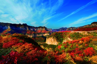 “春赏山花夏避暑,秋游红叶冬看雪。”这是沕沕水四季风光的真实写照。这里有典型的喀斯特岩溶泉,常年湍流,四季不竭,水质洁净甘洌,湖潭错落有致。泉水沿绝壁飞流直下,形成落差数十米的多级瀑布。它于以奇险峻秀著称的巍巍太行山半山涌出,直落谷底,喷浆碎玉,声震寰宇,“如白练之经于天,白虹之饮于泉”,赋予太行灵秀之美。到了秋季,这里是享誉太行的赏红叶佳处,满山特产黄栌树层林尽染,真正是“霜叶红于二月花”。每当秋风起、霜叶红,游客乘坐电瓶车依山而行,赏漫山红叶,听林间泉声,秋色醉人。