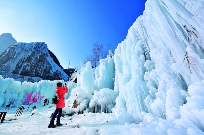 入得山门,一整面冰瀑扑面而来,在阳光下闪着纯净的淡蓝荧光,仿若童话里的冰雪城堡。整个景区被皑皑冰雪覆盖,瀑布完全冻结成了硬实的冰瀑,凌空垂挂,雄浑壮丽,令人叹为观止。景区内冰瀑冰挂随处可见,冰凌冰柱姿态各异,晶莹剔透,华美壮观,摄人心魄。抬头可见巍巍太行,裸露的石灰岩层次分明,冰雪覆盖其上,气势磅礴,尽展浩瀚之气魄,让人不禁想起“北国风光,千里冰封,万里雪飘”的壮观景象。当夜幕降临,各处冰柱、冰笋、冰凌、冰花在彩光的照射下,时而红光剔透,时而绿彩晶莹,梦幻般的色彩光影在冰雪城堡中流动。