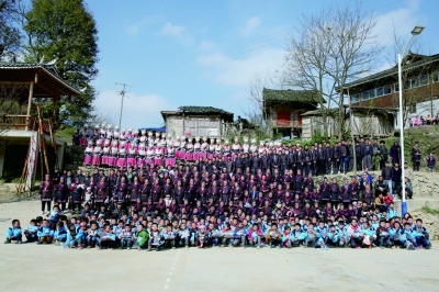 云贵高原大山深处的剑河县高标村,历史上曾是千户苗寨,现住有280多户苗族同胞。这里古树参天,人与自然和谐统一,村寨民风淳朴,民族文化浓厚。逢年过节或者重大活动时,村里都要跳芦笙舞、唱苗族飞歌,前来参与活动的人进寨出寨都要喝三道拦门酒。2015年年底,村寨修通了柏油路,沉浸在幸福中的村民,愉快地照起了全家福。