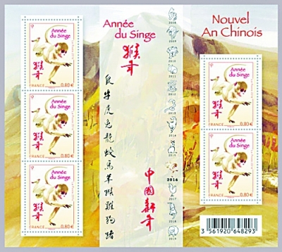 为庆祝即将到来的中国农历新年,法国邮政总局29日在巴黎举行猴年生肖纪念邮票首发仪式。至此,法国邮政总局历时12年,已完整发行了一轮生肖邮票。