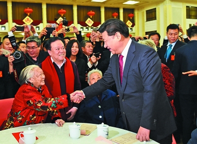 团拜会上,习近平等党和国家领导人来到大家中间,同大家亲切握手,互致问候和新春祝福。文艺工作者表演了精彩节目。