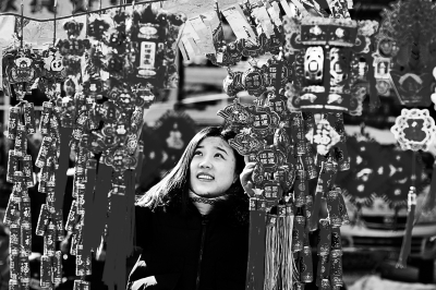 山东省沂源县,一名女士在年货大集上选购新春饰品。新华社发(赵东山摄)