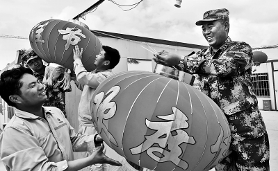 2月7日,南沙美济礁建设者和官兵一起悬挂红灯笼。新华社记者 赵颖全摄