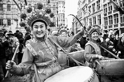 2月6日,中国驻比利时大使馆与布鲁塞尔市政府联袂在布鲁塞尔市中心大广场首次举办“欢乐春节”盛装巡游活动。除了1000多名中比艺术家,北京市朝阳区“红半天”女子鼓乐团和上海市奉贤区民俗表演团也参加了巡游。据悉,“欢乐春节”庆祝活动将持续一周。图为北京朝阳区的“红半天”女子鼓乐团在布鲁塞尔大广场表演。本报驻布鲁塞尔记者 刘军摄