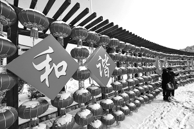 2月9日,黑龙江省双鸭山市饶河县,市民在落雪的一排排红灯笼旁留影。新华社发(许丛军摄)