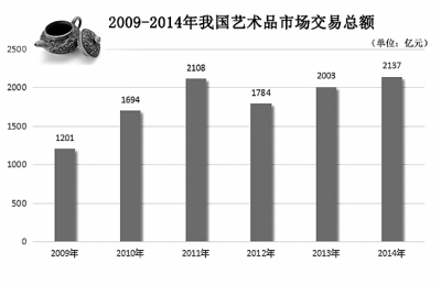数据:据文化部文化市场司发布的数据,2009年至2014年,我国艺术品市场交易总额分别为1201亿元、1694亿元、2108亿元、1784亿元、2003亿元和2137亿元,虽有波动,但整体呈上升趋势。然而,2015年我国艺术品交易开始“遇冷”。中国拍卖行业协会、雅昌艺术市场监测中心等机构发布的艺术品拍卖数据显示,2015年我国艺术品拍卖量、成交量同比均有较大幅度下降。