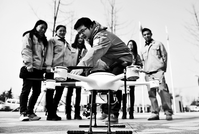 2月26日,无人机培训班教练在向学员演示无人机的操控。当日,安徽省首家获得中国航空器拥有者及驾驶员协会(AOPA)授权的无人机“驾校”在位于安徽合肥市的清华大学合肥公共安全研究院开班,经培训合格的学员将“持证上岗”,服务应急救援、环境监测、航拍测绘等多个领域。