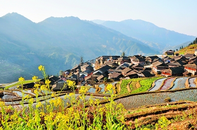 2月29日,贵州省从江县加榜梯田油菜花开,扮美苗寨。新华社发
