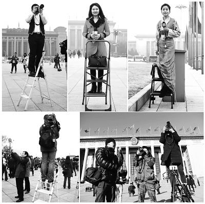 参加2016年两会报道的记者众多,为了拍到独特的视角,很多记者带着梯子上两会。本报记者 郭俊锋摄