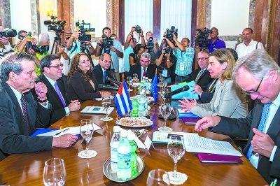 3月11日,在古巴首都哈瓦那,古巴外长罗德里格斯(前左二)与欧盟外交和安全政策高级代表莫盖里尼(前右二)举行会谈。古巴与欧盟11日在古巴首都哈瓦那签署旨在推动双边关系正常化的框架协议。古巴与欧盟是在当天举行的第七轮谈判后达成这一协议的。古巴外长罗德里格斯与欧盟外交和安全政策高级代表莫盖里尼出席协议签署仪式。新华社记者 刘彬摄