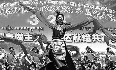 3月27日,拉萨市城关区民间艺术团演员表演《吉祥芒康》。当日,拉萨市城关区举行文艺演出活动,庆祝即将到来的西藏百万农奴解放纪念日。2009年1月19日,西藏自治区九届人大二次会议决定,将每年3月28日定为西藏百万农奴解放纪念日。 新华社记者 觉果摄