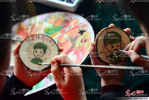 日前,山东聊城大学美术学院、教育科学学院的大学生们利用周末时间举办了“雷锋精神永驻我心”主题宣传教育活动。图为大学生们在创作有关雷锋肖像的树片水粉画作品。赵玉国摄/光明图片