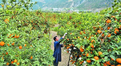 目前正是四川省石棉县黄果柑上市季节。今年,越来越多的果农通过微信、淘宝网店等电商形式出售黄果柑,仅中国邮政平台就已为果农发出石棉黄果柑近20万公斤。图为3月27日,在石棉县安顺场,一位果农在采摘黄果柑。