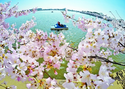 3月26日,在美国首都华盛顿的潮汐湖,游客划船观赏樱花。近日,华盛顿潮汐湖畔的数千株樱花正值盛放期,吸引了大批游客。 新华社记者 殷博古摄